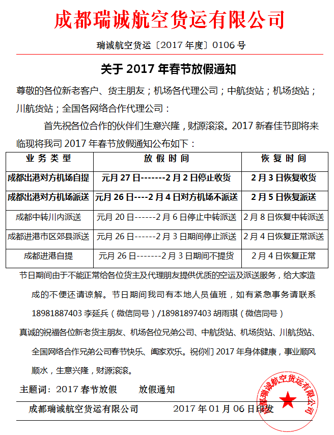 2017年春节公司放假通知及工作安排